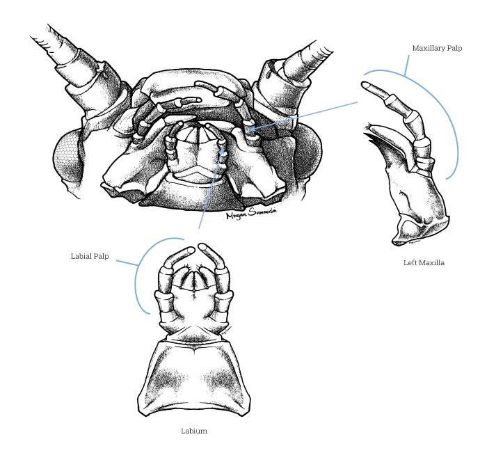The paired and segmented appendages around the mouth arising from maxillae (one palpus on each maxilla) and the labium (one pair); maxillary palpi are the larger pair. Plural form is palpi. See also palp.